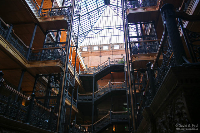 Our next stop of the day was the Bradbury Building, a registered historical and cultural landmark in downtown LA. Today it houses the LAPD Internal Affairs division, but it’s interest comes from both the design of the interior and it’s use in many film and TV productions including Blade Runner. The closest parking we could find for this cost $5 as a day rate near the LA Times building, but we only needed 20 minutes as once inside you can’t go above the ground floor.