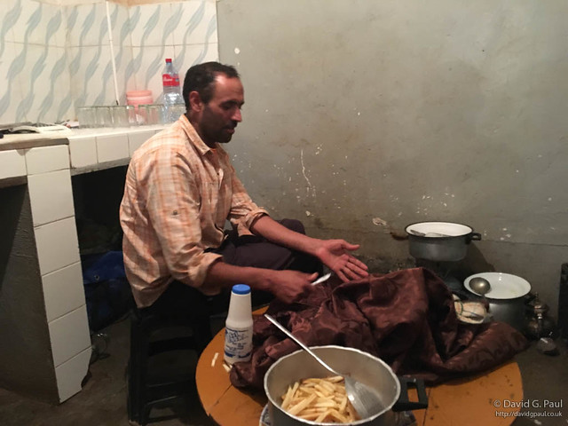 As dusk approached I went to see what the chef was cooking as I was sure I could smell chips, or as the Americans would call them – fries. My nose hadn’t deceived me – sure enough he was sitting their and frying potatoes using the equipment he’d been carrying on the back of the mule for the past few days.