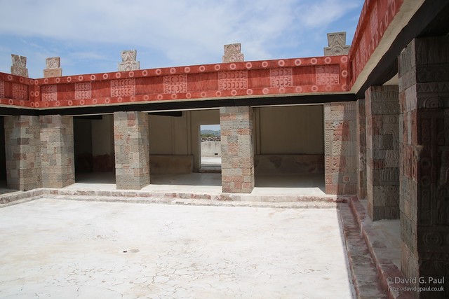 After descending we made our way over to the Palace of the Jaguars and the Palace of Quetzalpapalotl via a plinth in the middle of the plaza. In the Palace of the Jaguars some of the walls which were painted still retain their colour, though I don’t know how much of that is restoration as opposed to what was originally there. At the top of the raised area there were also a few lizards (real ones, not stone!) in amongst the bricks.