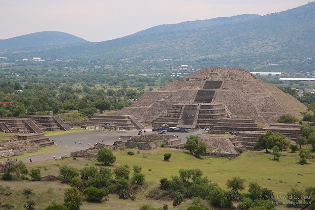 The drive then continued for some time along a major road, passing numerous settlements, until we entered the area where Teotihuacán is located. The road along this last section is cobbled so is quite bumpy; we did stop briefly though to take our first photos of the pyramid structures.
