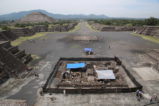 We made our way to the Pyramid of the Moon to start with – it was the smaller of the two large pyramids there and is situated at the end of the Avenue of the Dead. In front of this pyramid they were doing some excavations in the Plaza of the Pyramid of the Moon, and had an area marked out ready for further trenches to be dug. The stairs up the pyramid are fairly steep so they have a handrail for those that are not that steady on their feet or unsure about the height. I ran up them though and started to take photos looking back at the avenue and the Pyramid of the Sun. We couldn’t get to the very top of this pyramid though as they are still doing some restoration work to make it safe for tourists.
