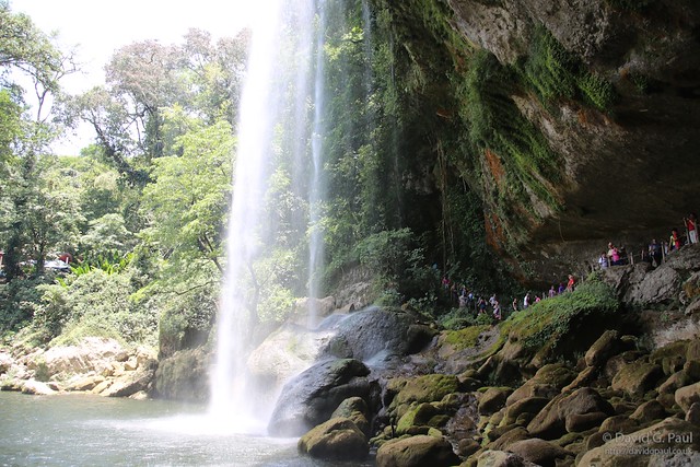 Again, the same person was late back to the tour bus, but we then continued on to Cascadas de Misol Há (in the Ch’ol language this means “waterfalls”) and arrived around 12:50. At this one we only had 35 minutes to look around. To start with we looked at the waterfall from the front, watching tons of water pour down from 35 metres above. Afterwards we followed another path that went behind the waterfall, across some algae covered rocks until we got to a 20 metre cave where you could look at the waterfall from the other side. Anyone wanting to enter the cave needed to pay 10 pesos. As we were short on time I didn’t get to go in unfortunately.