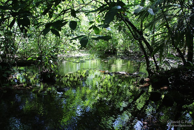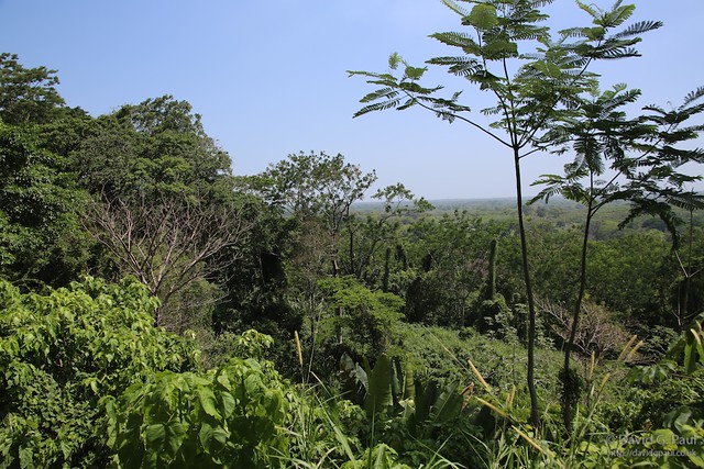 We passed a large termite nest protruding from the side of a log with hundreds of them scurrying around. For a long time our guide was looking for howler monkeys, but eventually he gave up and took us to what he called “the forgotten temple”. It was a fairly intact temple in the middle of the jungle, but some of the lower parts were damaged by tree roots growing through it. We climbed the stairs and had a look around this temple before carrying on through the jungle, crossing streams until eventually we got to a stone cave we could barely see into when crouching – but could just make out where bats were roosting on the ceiling. Sadly, although I had a flash for my camera with me, I’d left the batteries for it back at the hotel. This meant I couldn’t really attempt to photograph them.