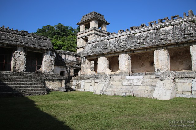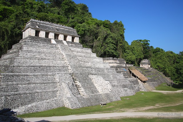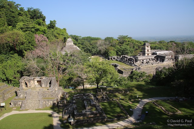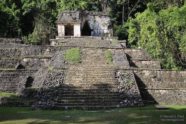 At a fast pace the tour continued around the palace, barely having time for photographing what was there or taking in any of the details. We quickly moved through the courtyard and passed the observation tower and eventually we had seen all of the palace. We moved on, over a bridge over the aqueduct, and through some trees until we reached more temples – the Temple of the Sun and the Temple of the Cross. We climbed to the top of the Temple of the Cross and took photos of the other temples we could see, including the palace and the Temple of Inscriptions in the distance.
