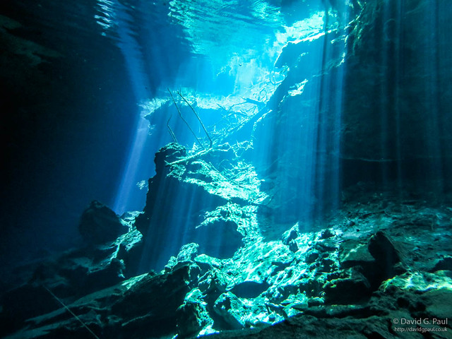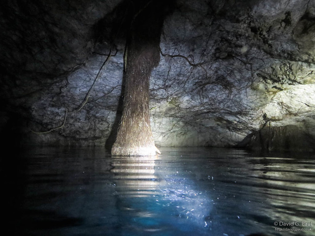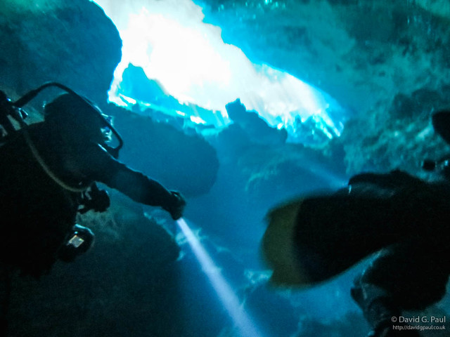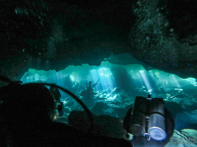 To start with we were shown the two entrances to the cavern system we’d be using and then went through a short briefing detailing where we’d be going, the safety precautions, and what we would be doing. Back at the car we prepared the diving equipment and then headed to the entrance for the Kukulkan cavern system. Once we’d done our buoyancy checks we then descended into the cavern and followed the guide rope around. Some of the route was pretty dark but it was impressive to see the beams of light shining down from the cavern entrance. Around the entrance there were also some rock formations that were impressive, but I found difficult to photograph as the camera struggled to focus in the dark.